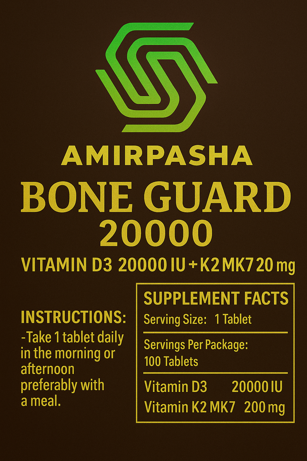 Bone Guard 20000™ is a premium bone-support supplement formulated for individuals who want strong, healthy bones and optimal calcium metabolism. Vitamin D3 (20,000 IU) boosts calcium absorption and supports immune function, while Vitamin K2 MK7 directs calcium into the bones and teeth, preventing arterial buildup and supporting cardiovascular wellness.