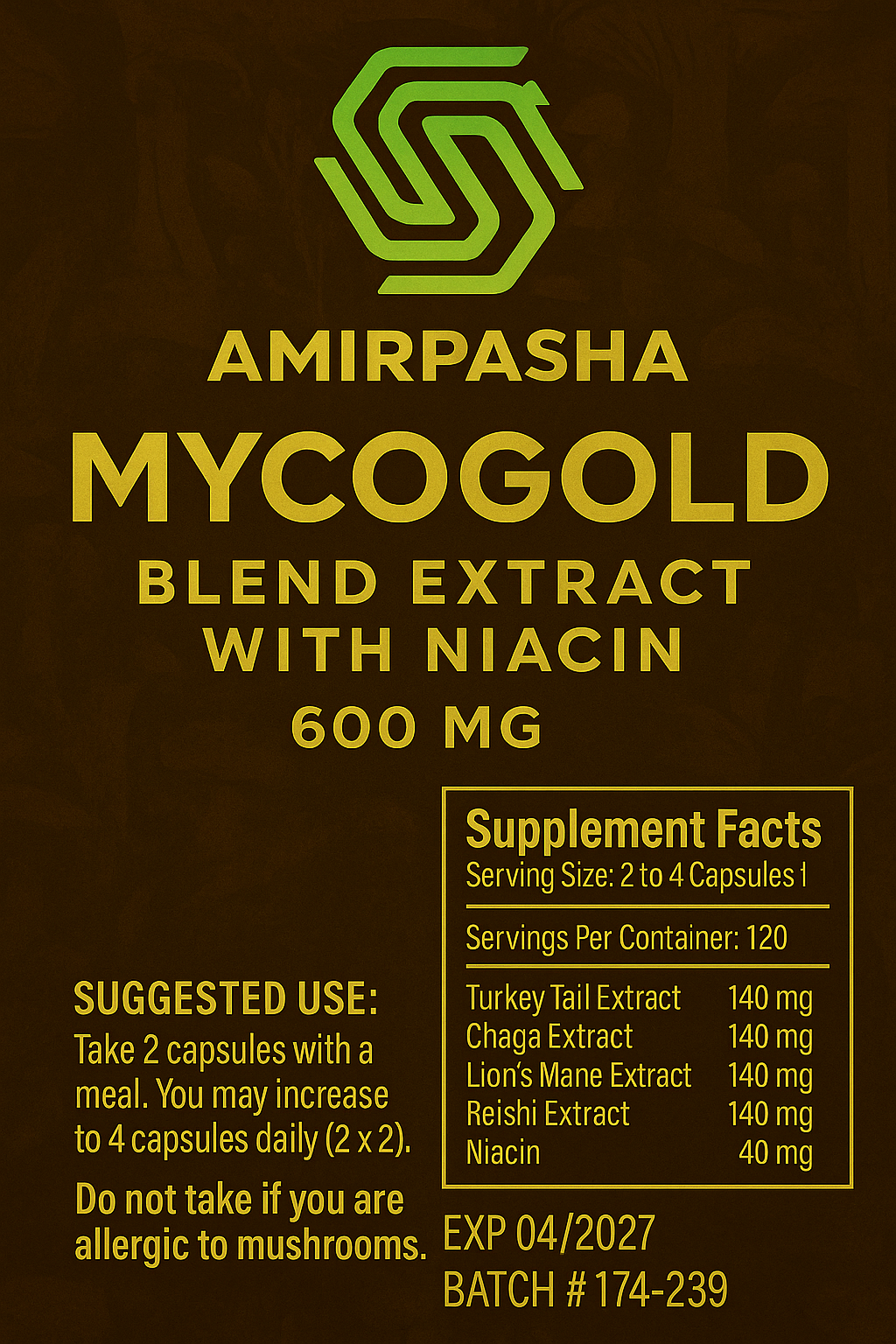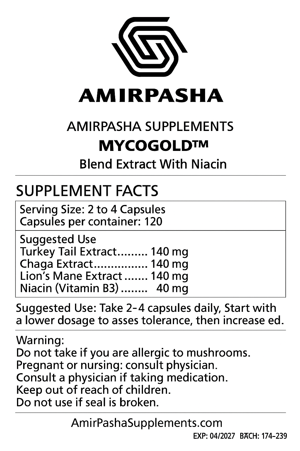 MycoGold™ – Lion’s Mane, Turkey Tail, Chaga + Niacin ( 600 mg )