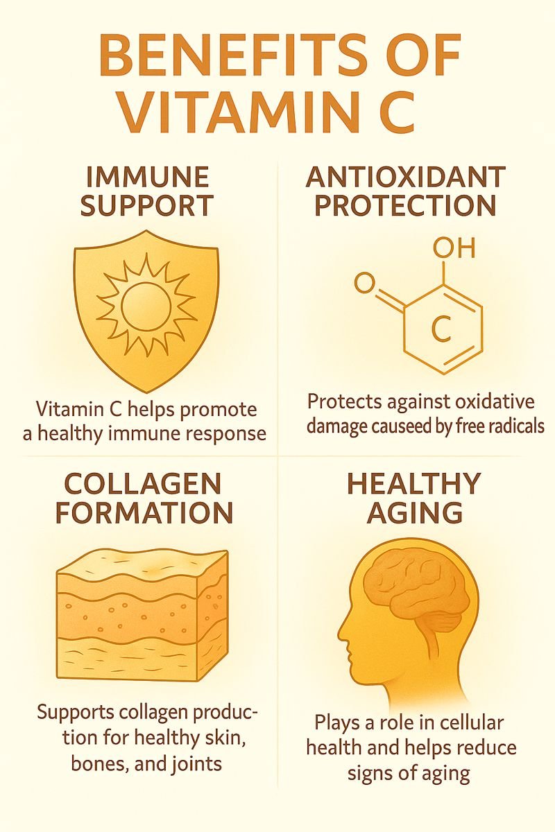 Vitamin C is an essential nutrient the human body cannot produce or store in large amounts. Daily intake supports immune defense, antioxidant protection, collagen production, and normal tissue repair.